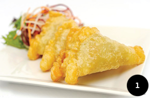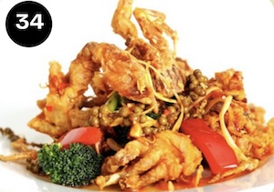 Stir-fried crispy softshell crab fillet with chilli, garlic, green peppercorn, Thai herbs & basil leaves