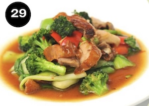 Crispy skin pork belly stir fried with green vegetables and oyster sauce