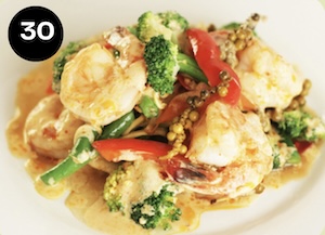 Stir-fried prawns with crushed chilli & garlic, green peppercorn, herbs, onion, beans & basil leaves