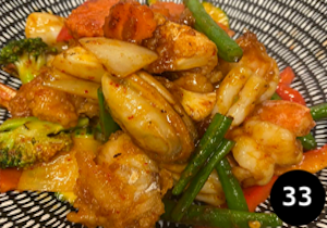 Stir-fried mixed seafood with chilli jam, onion, vegetables & Thai basil