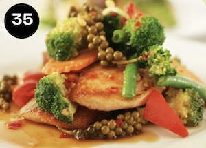Chicken stir fried with chilli, garlic, lemongrass and fish sauce topped with coriander