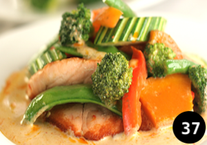 A mild panang curry with coconut milk, basil leaves and kaffir leaves
