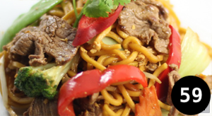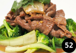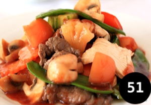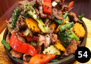 Marinated beef tossed in a hot wok with garlic, sesame oil, chilli and spicy sauce on top a bedding of mixed vegetable